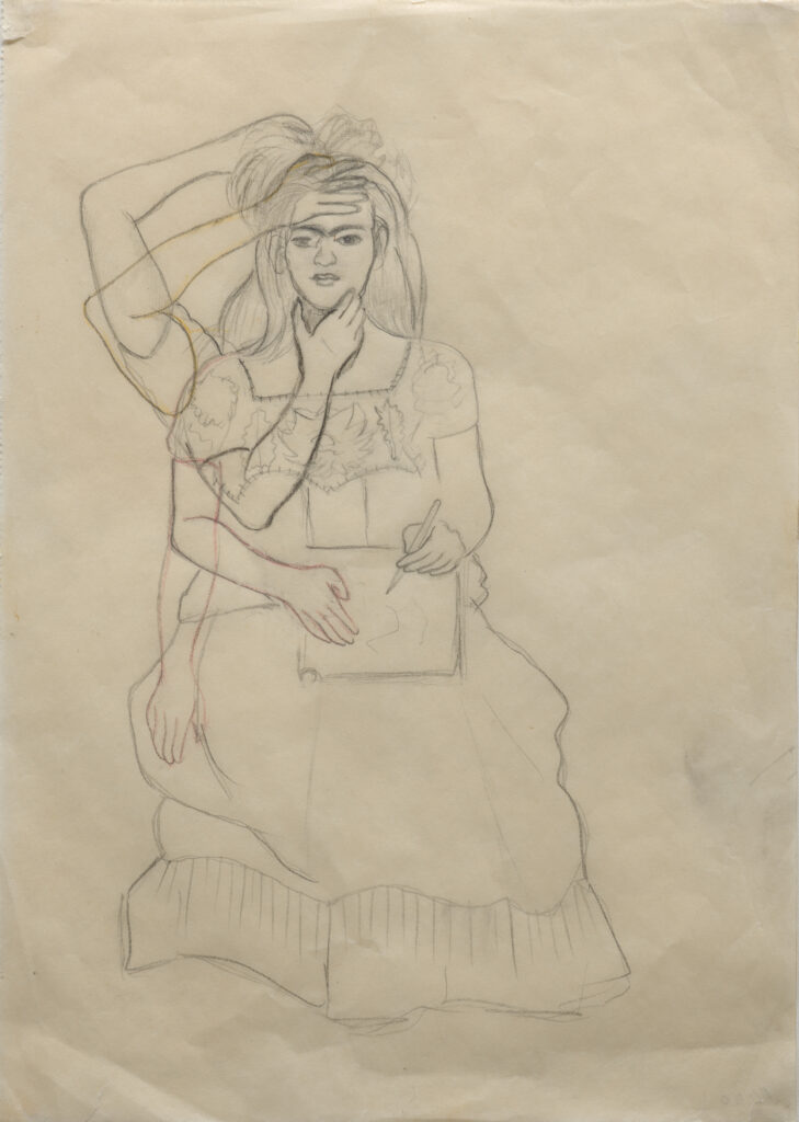 Frida Kahlo, Self-Portrait Drawing, pencil on paper, private collection. © 2024 Banco de México Diego Rivera Frida Kahlo Museums Trust, Mexico, D.F. / Artists Rights Society (ARS), New York.