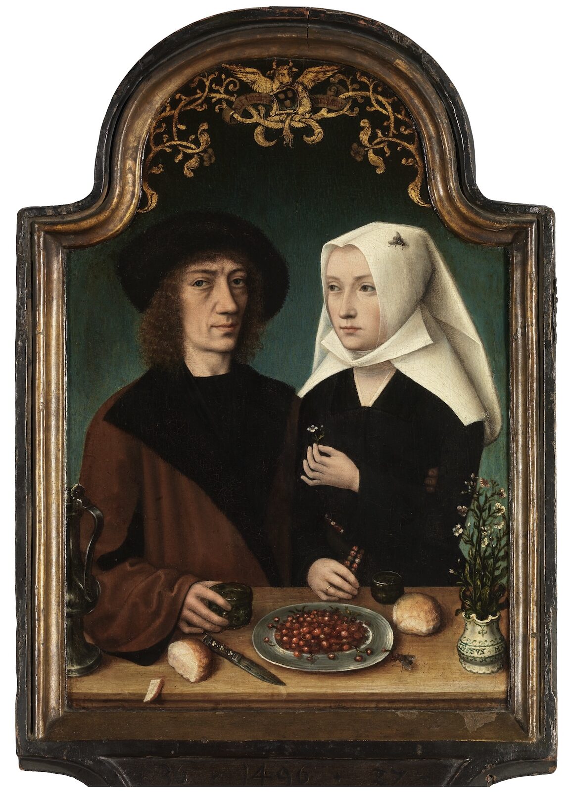 This famous Flemish painter’s style is easily recognizable, although he has never been known by name. This portrait of both him and his wife shows a simple table spread of a pitcher, bread, a vase of violets, and a bowl of cherries. There are also flies. Yep. The Master of Frankfurt used trompe l’oeil—an optical technique to make a painting seem three dimensional, often used in heavenly paintings—through flies, to make his painting appear to be real, and not an actual painting.