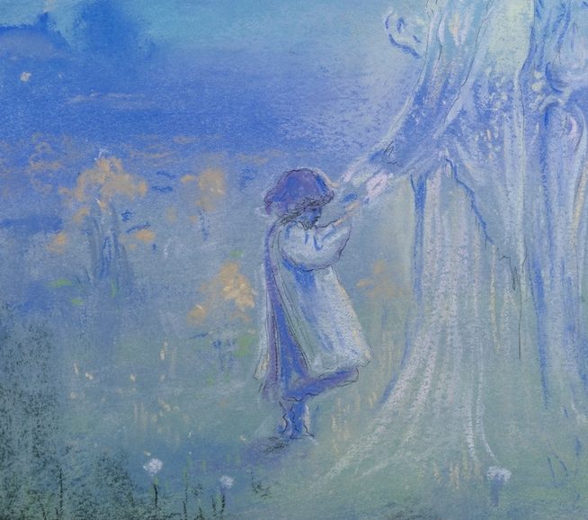 The Stolen Child is a pastel and pencil drawing. Three of Russell’s Sídhe stand in a landscape, softly colored in blue and lilac. The three tall creatures share features and identical dress. Their bodies overlap as if to emphasize their unity of spirit. Tenderly, the foremost Sídh reaches out to take the hands of a little girl. She looks vulnerably small and shy before the stately Sídhe. Her little body is sweetly rounded in shape, from her bobbed hair and round cheek, to the outward swing of her dress. In contrast the long robes worn by the Sídhe emphasize their great slender height.