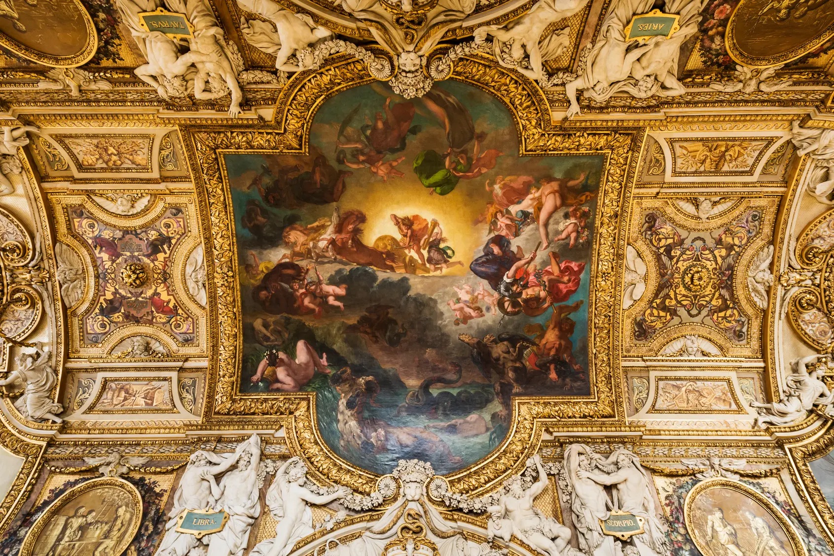 The Jay-Z and Beyoncé Louvre video starts with shots of the Galerie d’Apollon‘s ceiling. At the request of Louis XIV, in 1663 Charles Le Brun painted the race of the sun (Apollo, the Roman god of the sun) through time and space. During the second half of the 18th century, when the Academy of Painting occupied the gallery, the painters Taraval, Durameau, J. J. Lagrenée, Callet and Renou completed the decoration with canvases which were their pieces of reception at the Academy. From 1848 to 1850, the gallery was restored by the architect Duban who commissioned Delacroix to the central composition, and Müller’s and Guichard’s two compositions.