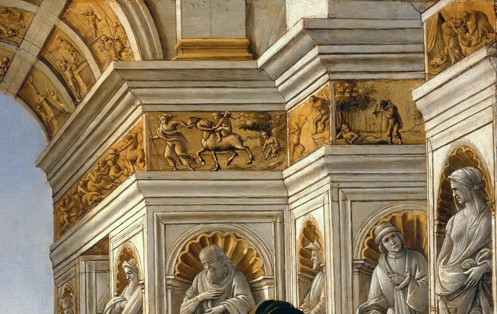 The painting is really tiny (compared to the majority of his works), 62 x 91 cm (24.41 x 35.83 inches), and his detailed technique rather brings to mind miniatures than images on wood. Look at the miniature mythological and religious scenes on the architectural reliefs in the background—they are so sharp and clear, so thoroughly thought out.