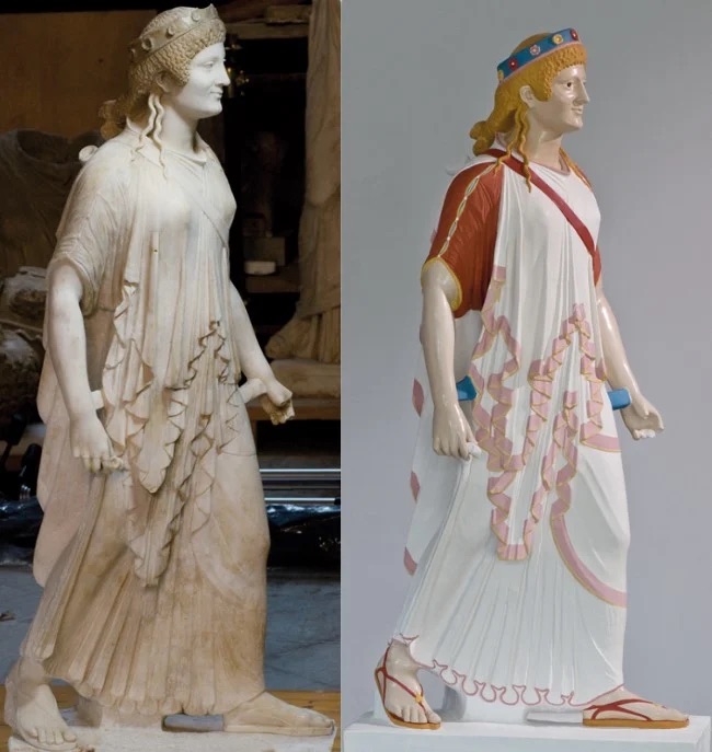 Left: Venus Lovatelli, 1st century CE, National Archaeological Museum, Naples, Italy. Oxfordre; Right: Vinzenz Brinkmann, Ulrike Koch-Brinkmann, Colorized Replica of Venus Lovatelli from Pompeii, Polychromy Research Project. Smithsonian Magazine.