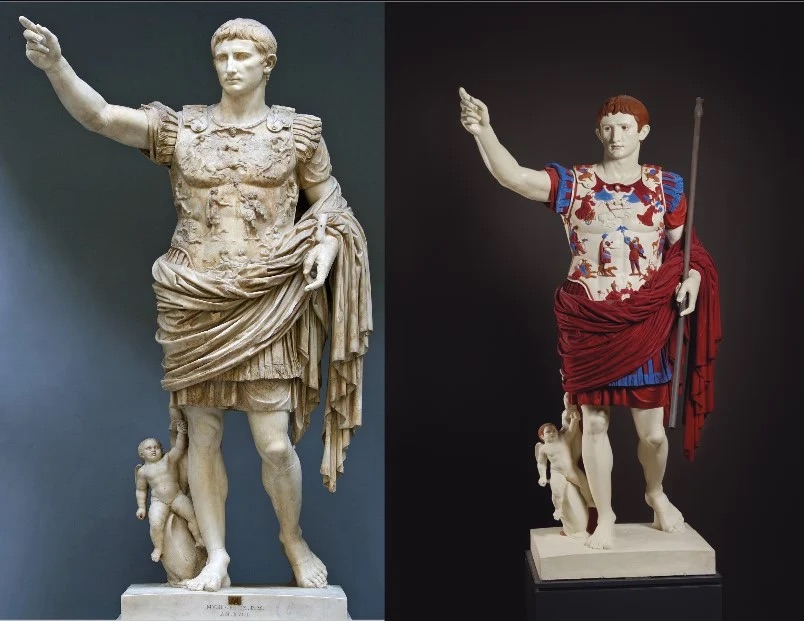Left: Augustus of Prima Porta, 1st century CE, Vatican Museums, Vatican City. Wikimedia Commons (public domain); Right: Colorized replica of Augustus of Prima Porta, 2004, Ashmolean Museum of Art and Archaeology, Oxford, UK. Frieze.