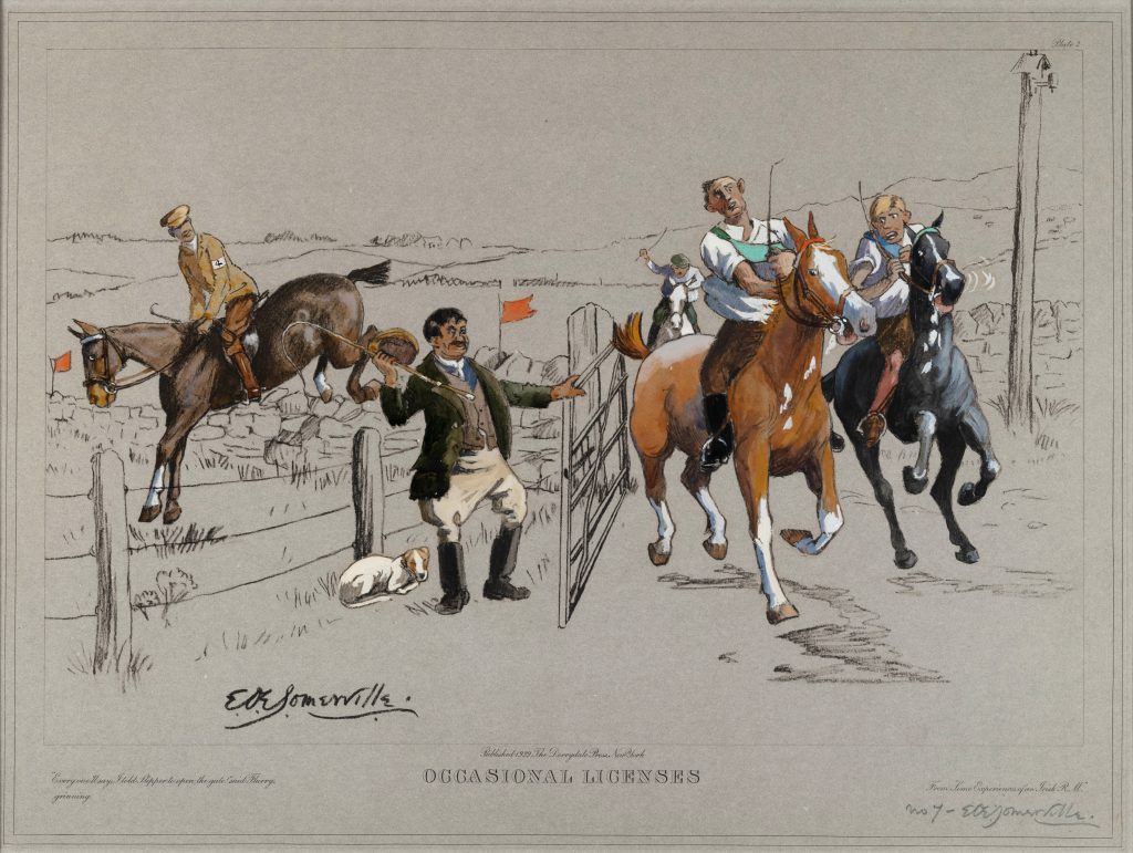 In addition to her work as a writer, Somerville served as an illustrator to her literary works. However, she didn’t illustrate her novels just because she could, she was a competent and successful artist in her own right. Below are two of her illustrations for the Irish R.M. books in the collection of the National Sporting Library & Museum (NSLM) in Middleburg, Virginia. The NSLM actually has two sets of the same illustrations: one set of four is labeled “number 7” and the other is “number 27” in the limited series produced by Derrydale Press. The tonalities between the sets vary slightly, which is neat to see.