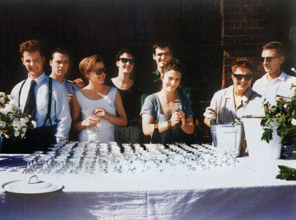 Freeze opening party, showing (left to right): Ian Davenport, Damien Hirst, Angela Bulloch, Fiona Rae, Stephen Park, Anya Gallaccio, Sarah Lucas and Gary Hume. Phaidon.
