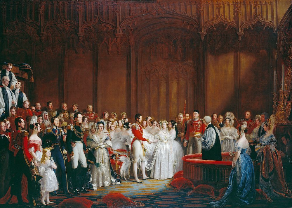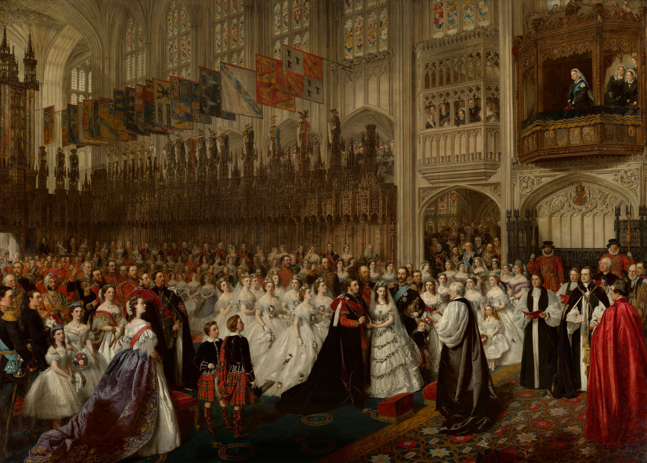 This painting depicts the wedding of Queen Victoria and Prince Albert’s eldest son Edward to Princess Alexandra of Denmark. This wedding came as a relief to the Queen, as she had been concerned by Edward’s irresponsible ways and hoped that the marriage would bring stability. The wedding took place at St George’s Chapel in Windsor rather than in the capital as the court was in mourning due to the recent demise of Prince Albert.