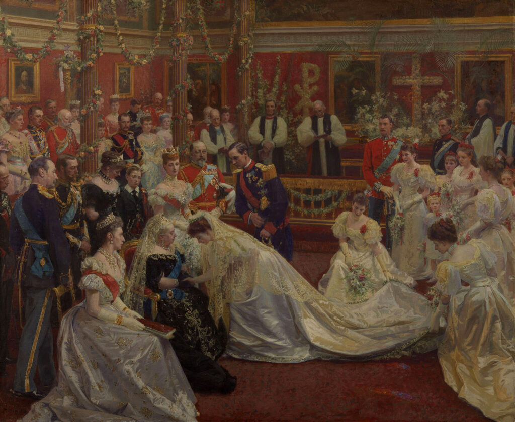 This painting depicts the wedding of Queen Victoria’s granddaughter, Princess Maud, to Prince Charles of Denmark on July 22, 1896. This couple was married in the Private Chapel at Buckingham Palace. It depicts the regent clasping the bride’s hand after the wedding, a tender moment between the powerful grandmother and her granddaughter.