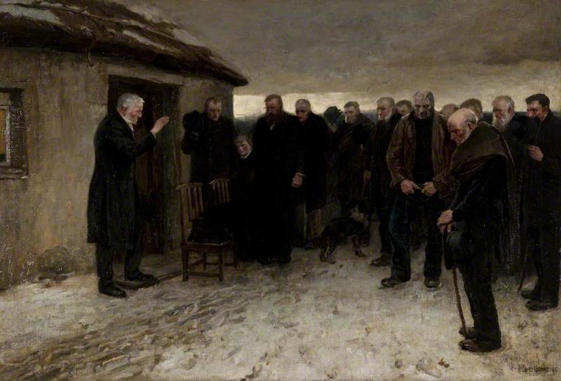 Two of the most preeminent figures of the group were James Guthrie (1859–1930) and John Lavery (1856–1941). The former was self-taught, but that did not prevent him from becoming the mainstay of the group. Influenced by French Realism—Jules Bastien-Lepage and Gustave Courbet, his style moved closer to Impressionism around 1882. The day-to-day matter of the topics and the new treatment of tonality and brushstroke in his later paintings manifest this change. One of his earliest works, A Funeral Service in the Highlands, seems to be directly inspired by Courbet’s The Burial at Ornans.