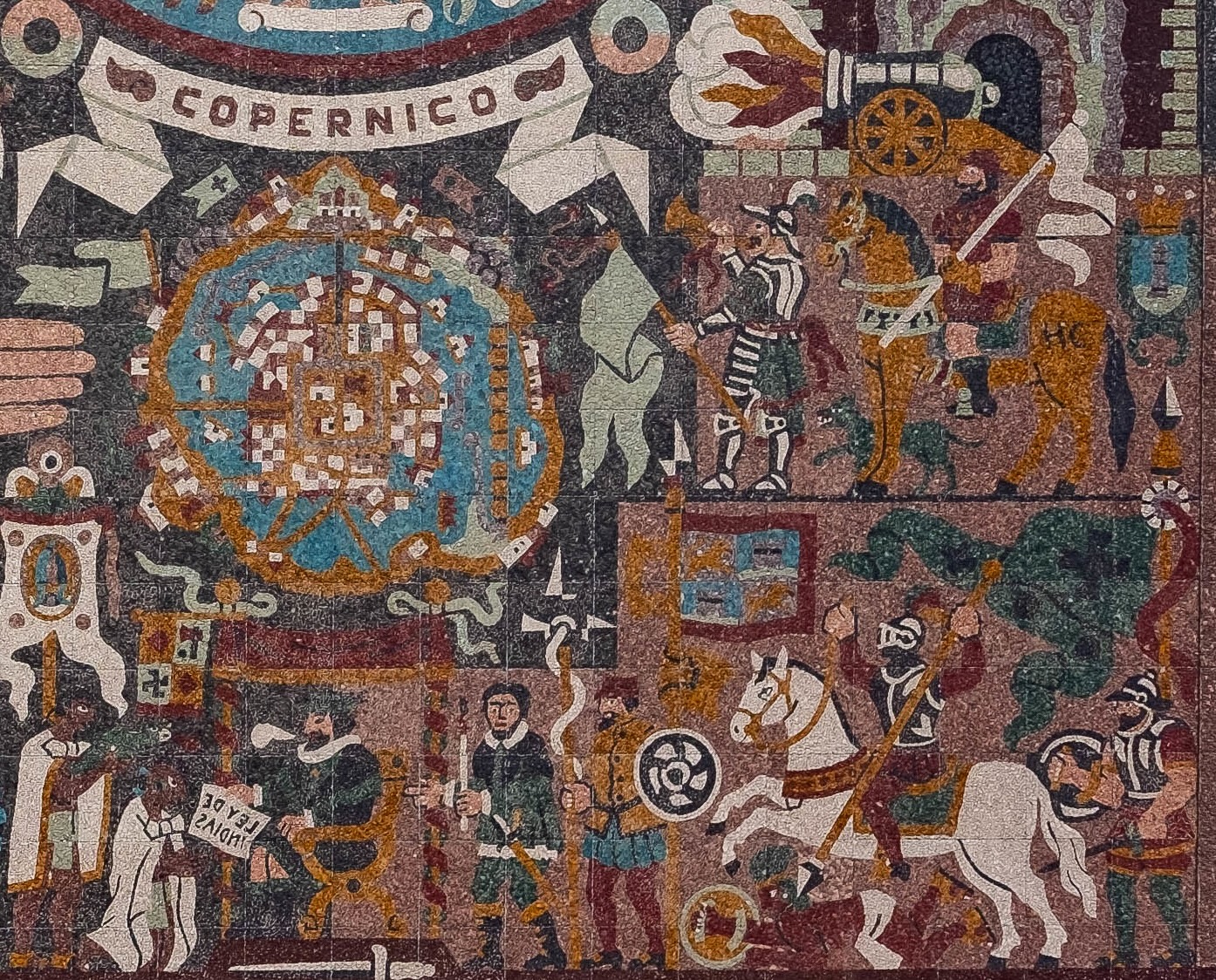 Juan O’Gorman, Historical Representation of Culture (north wall), 1952–1956, Mexico City, Mexico. Photograph by Armineaghayan via Wikimedia Commons (CC BY-SA 4.0). Detail.