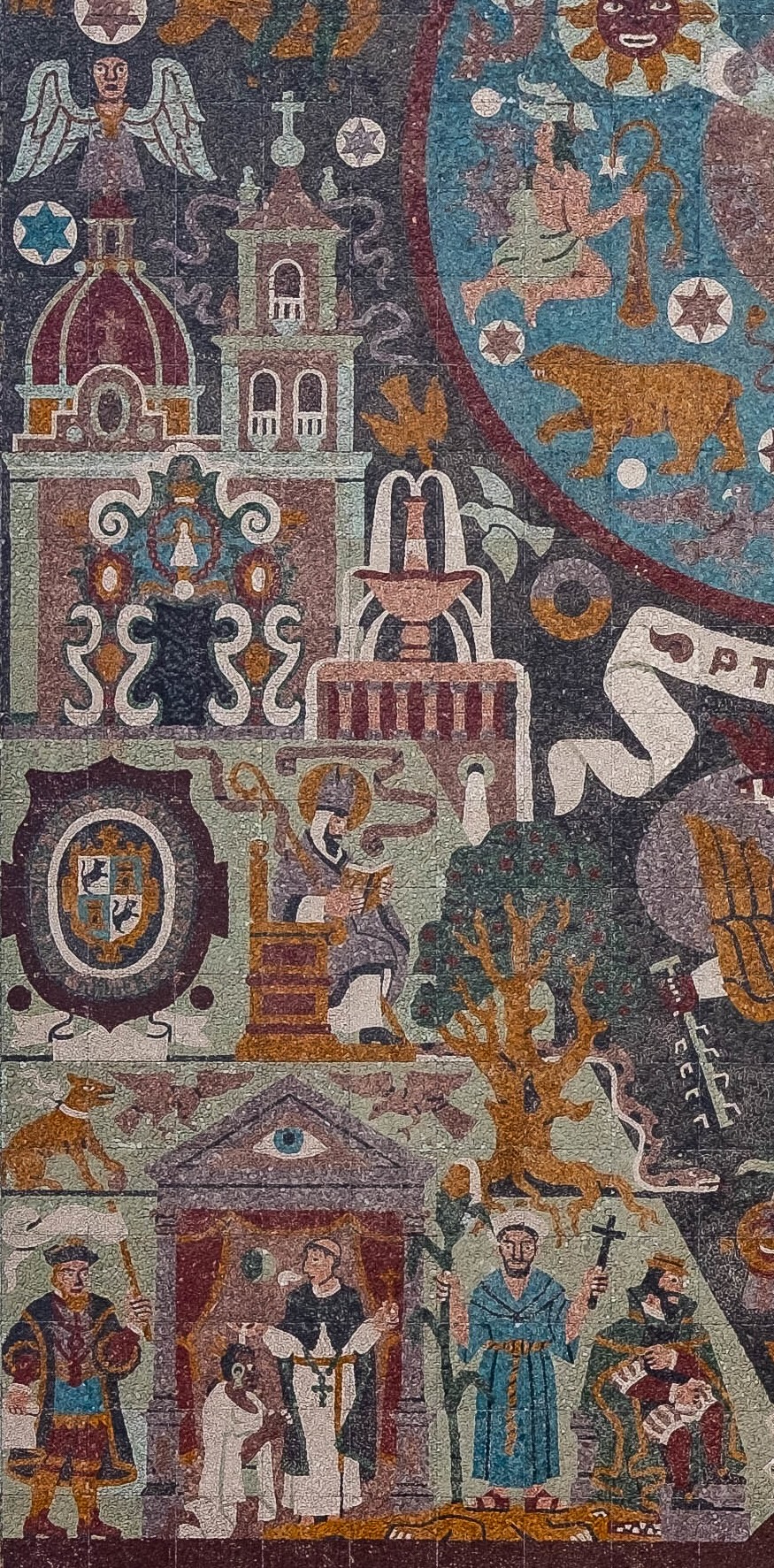 The Latin inscription Plus ultra, which is visible in the middle of the mosaic, refers to the Greek myth about Hercules, who put two columns in Gibraltar to mark the end of the world known to humans. As the Spaniards conquered Mexico, the end shifted to the newly acquired colony.
