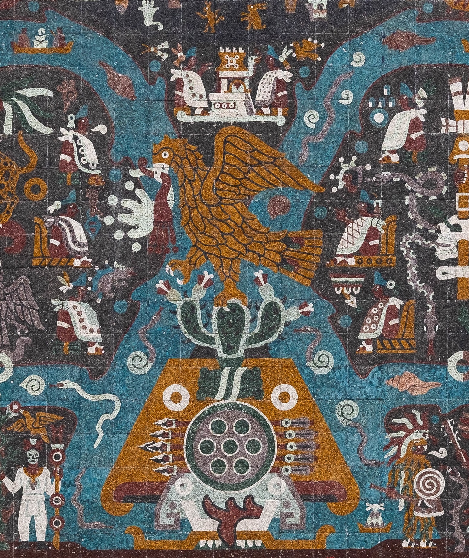 The whole surface is divided by the water canals that wash the Tenochtitlan, capital city, with the cactus (nopal) and the eagle with the serpent in its beak. These currents also delineate the vicinity towns: Coyoacán, Churubusco, Iztapalapa, Xochimilco, Azcapotzalco, and Tacuba. According to the origin myth of the Mexicas (the tribe popularly known as Aztecs), they migrated from Aztlán (land in today’s New Mexico, Arizona, and Texas) and found a new motherland in the Valley of Mexico, in a place where an eagle sitting on a cactus devouring a snake was encountered. They created Tenochtitlan.