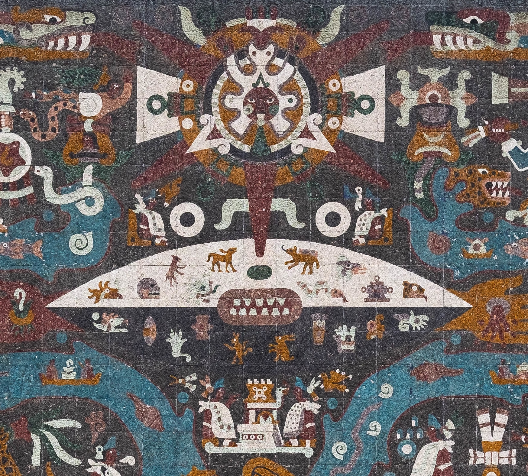 In the highest part is Tláloc, who the Mayans believed was the god of water, overlooking the cosmos, from whom the waters spring. Below him, there is Tlazōlteōtl, the “goddess of childbirth.”