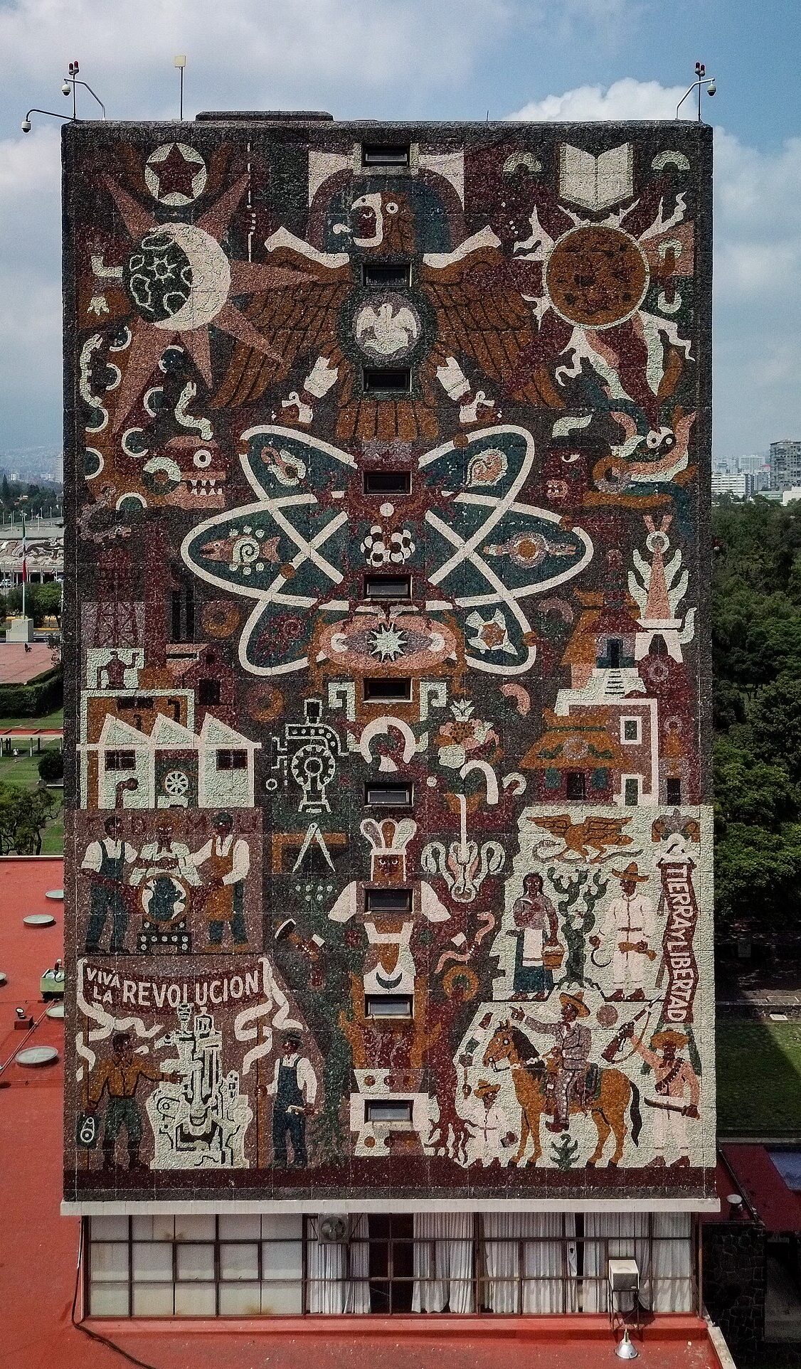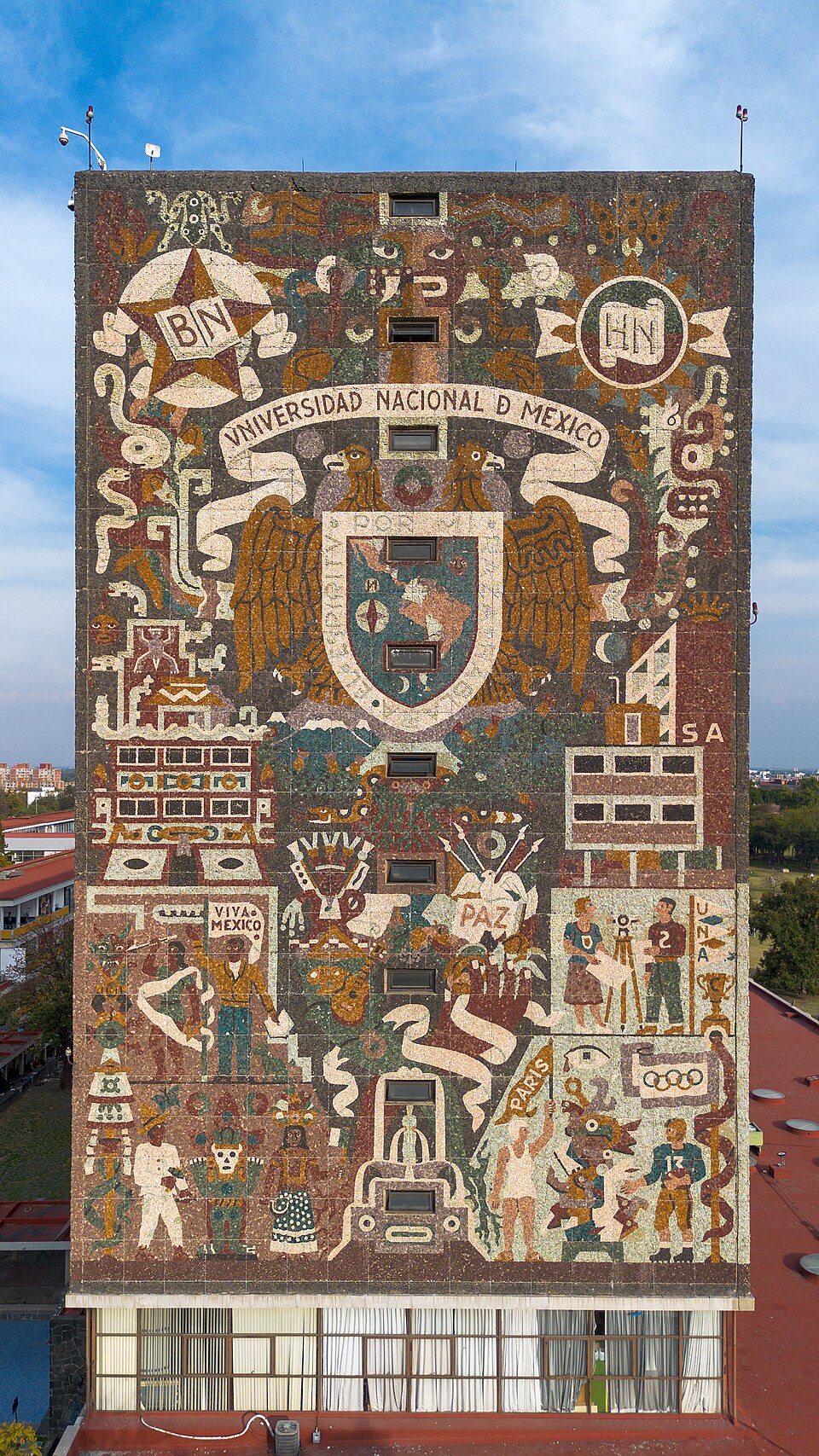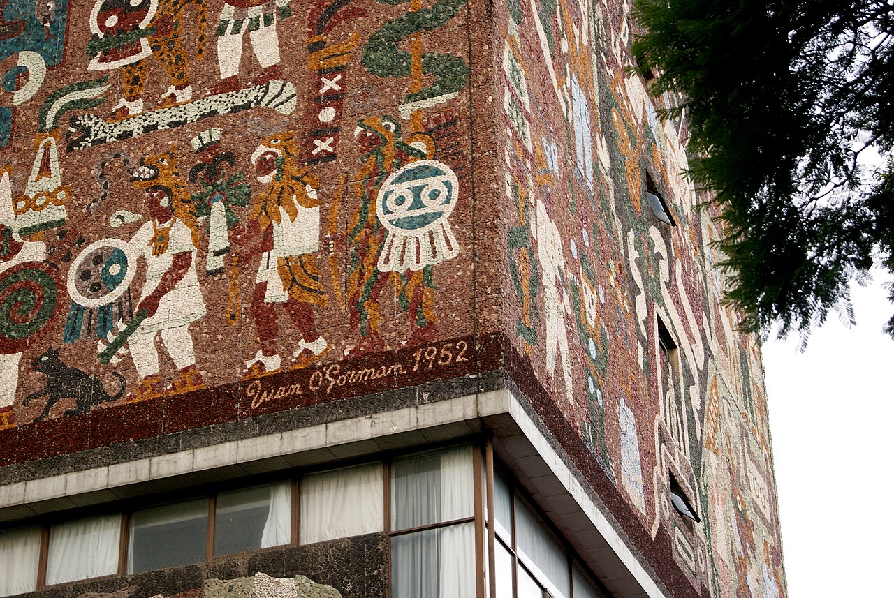 The National Autonomous University of Mexico (UNAM) is situated in Ciudad Universitaria, a beautiful complex of modernist buildings planned by a group of architects, including Enrique del Moral, Mario Pani, Teodoro González de León, and Luis Barragán. In its center stands the Central Library, which dominates the campus. The library is not only admired for its architectural design, but also for the enormous mural titled Historical Representation of Culture, created by Juan O’Gorman. The work covers all four walls of the building. It is the largest mural in the world, made of natural stones, found only in Mexico.