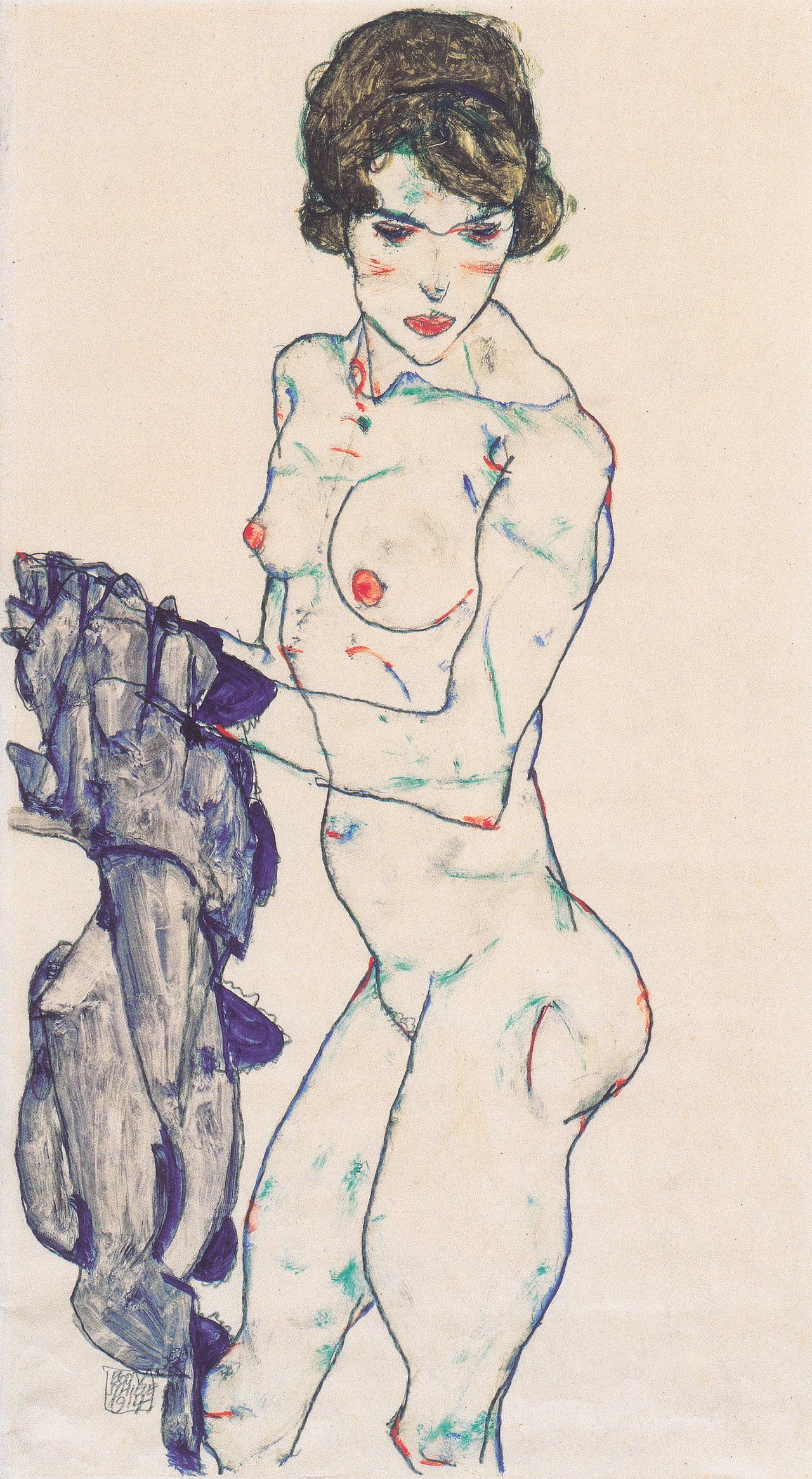 Egon Schiele’s nudes can challenge us and our preconceptions of the artistic tradition of the “nude”. He didn’t paint or draw idealized goddesses. He preferred to present female and male genitalia in full light. Many of the female nudes remind one of pornographic images and include props, such as stockings, typically associated with prostitution. Schiele often asked sex workers to model for him, but he also portrayed other women who were close to him. You can’t escape the palpable eroticism of his work, which is often truly explicit.