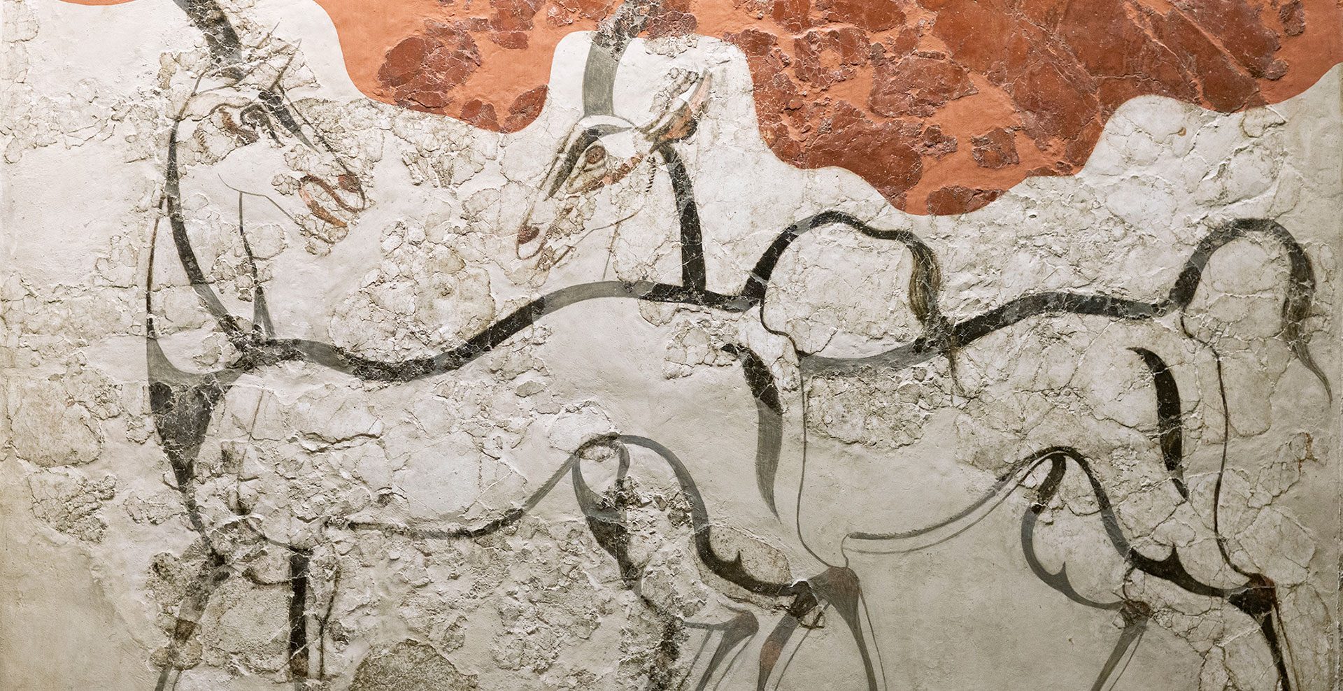 In the same room as the boxers, the other walls were decorated with images of antelopes. Alone or in pairs, the animals are represented with thick black lines on a white background. Τhe antelopes along with the boxers form a larger symbolic composition of young humans and animals.